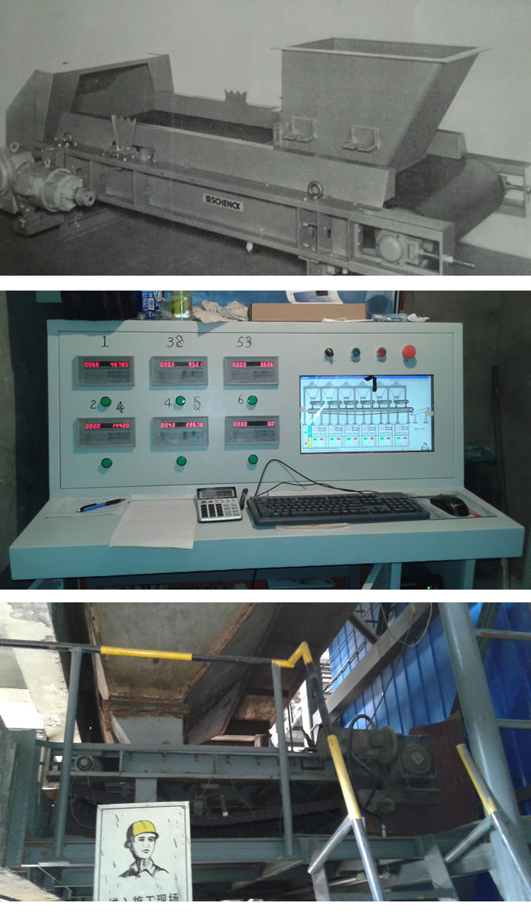 一台电脑控制六台定量给料机,用电脑进行配比操作,用变频器调节皮带地快慢,用控制仪表来调节补给量。